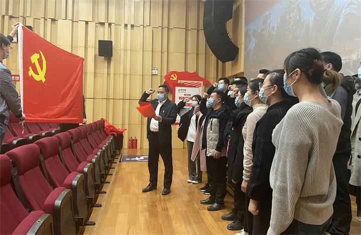 觀影前,面向鮮紅的黨旗,城投實(shí)業(yè)黨支部副書記聶茂良帶領(lǐng)全體黨員干部職工重溫入黨誓詞。