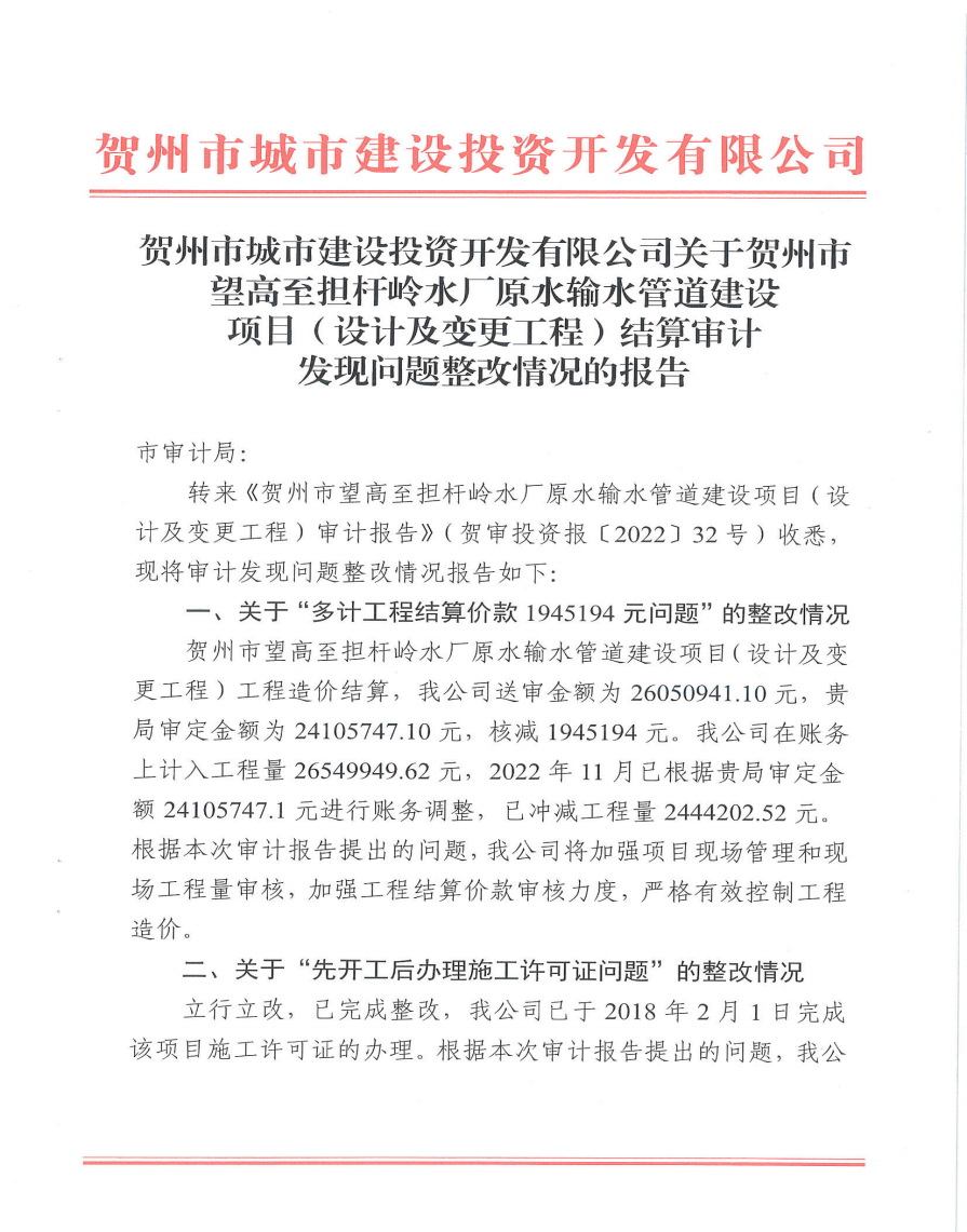 下一篇:城投公司關于城區公交站(亭)建設項目結算審計發現問題整改情況的報告